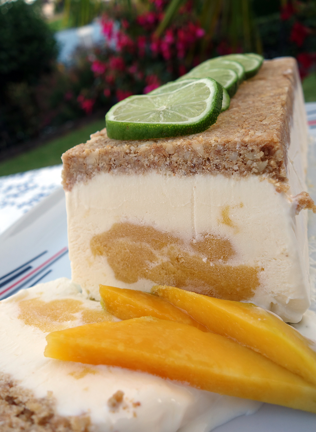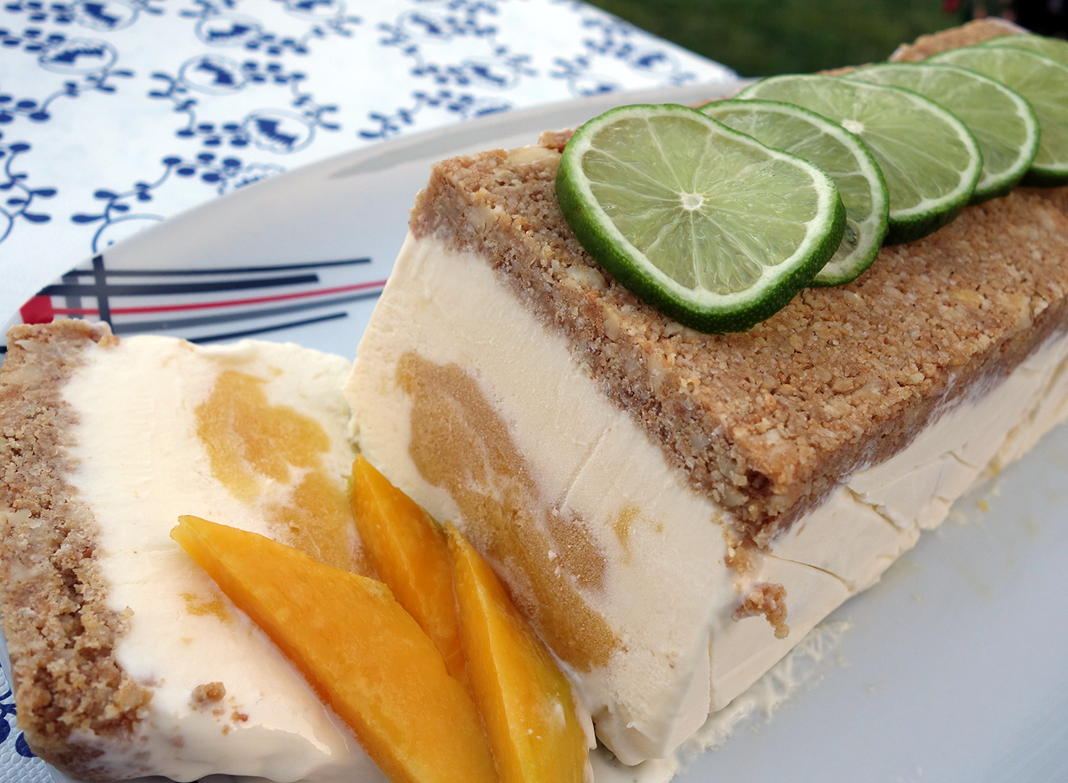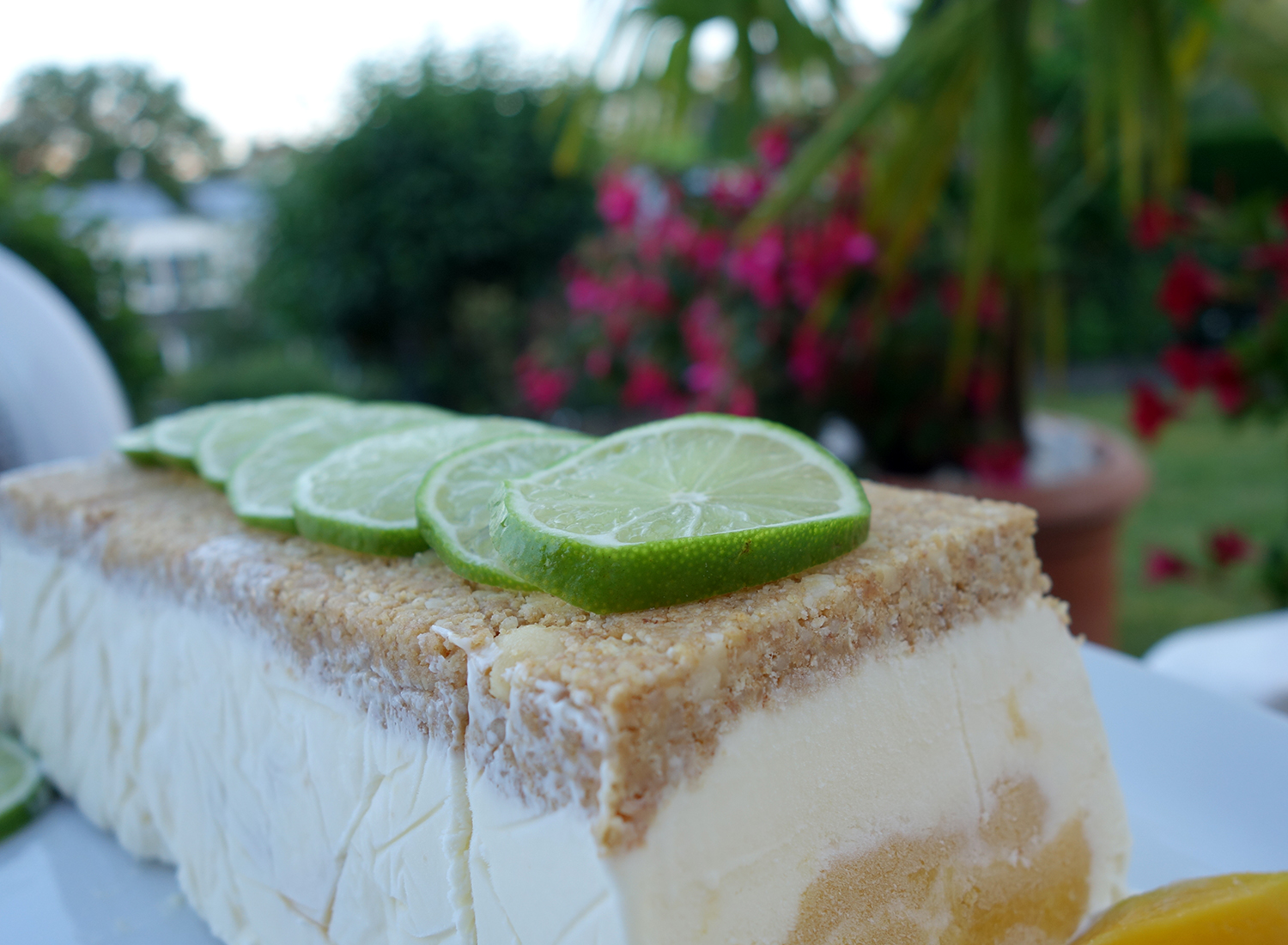 5. Vor dem Servieren aus der Form stürzen 15-20min antauen lassen. Mango und Limette in dünne Scheiben schneiden und Kuchen damit verzieren.