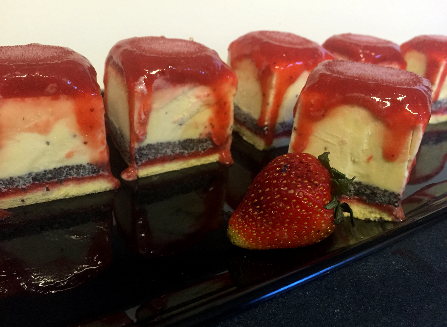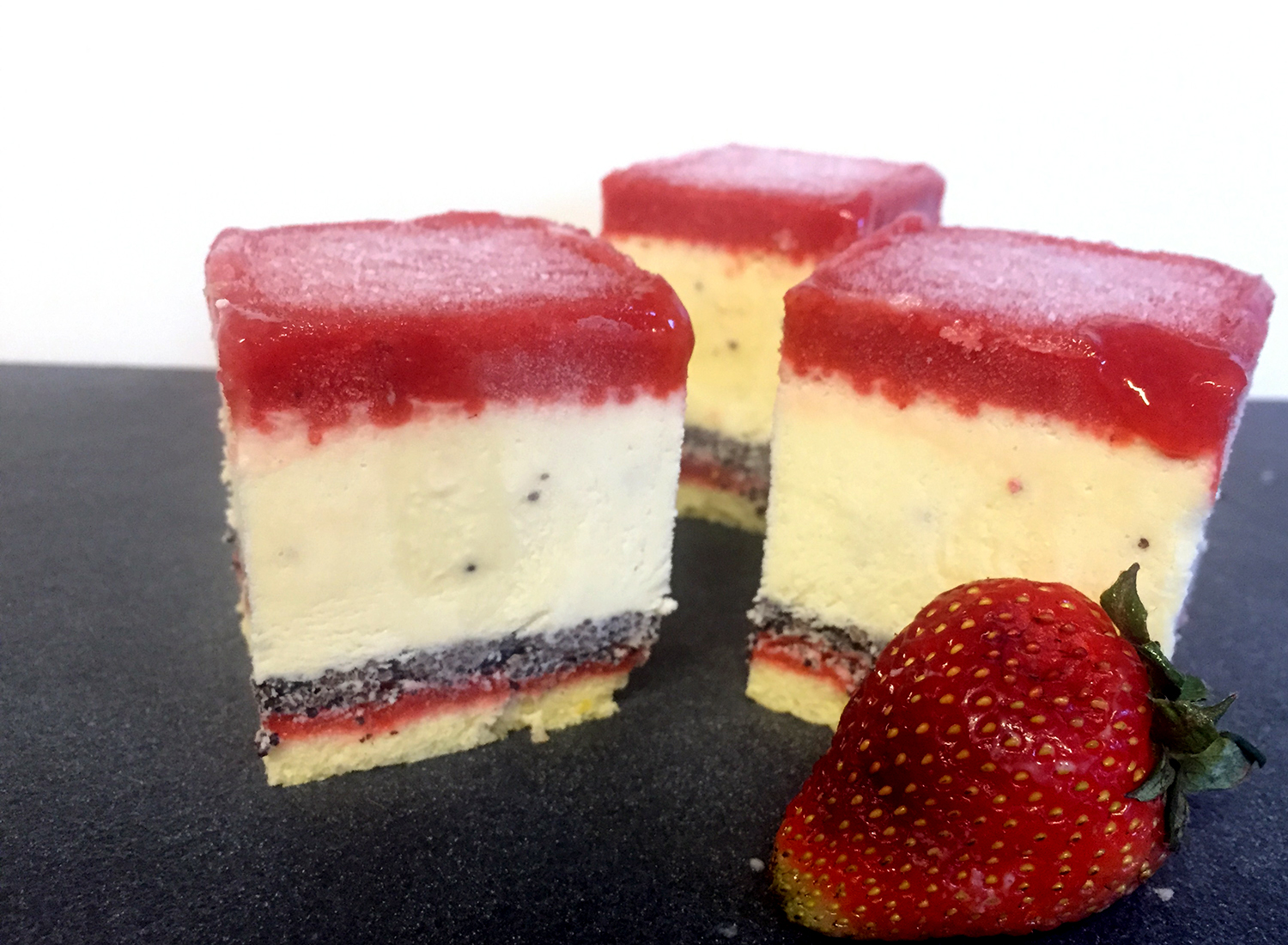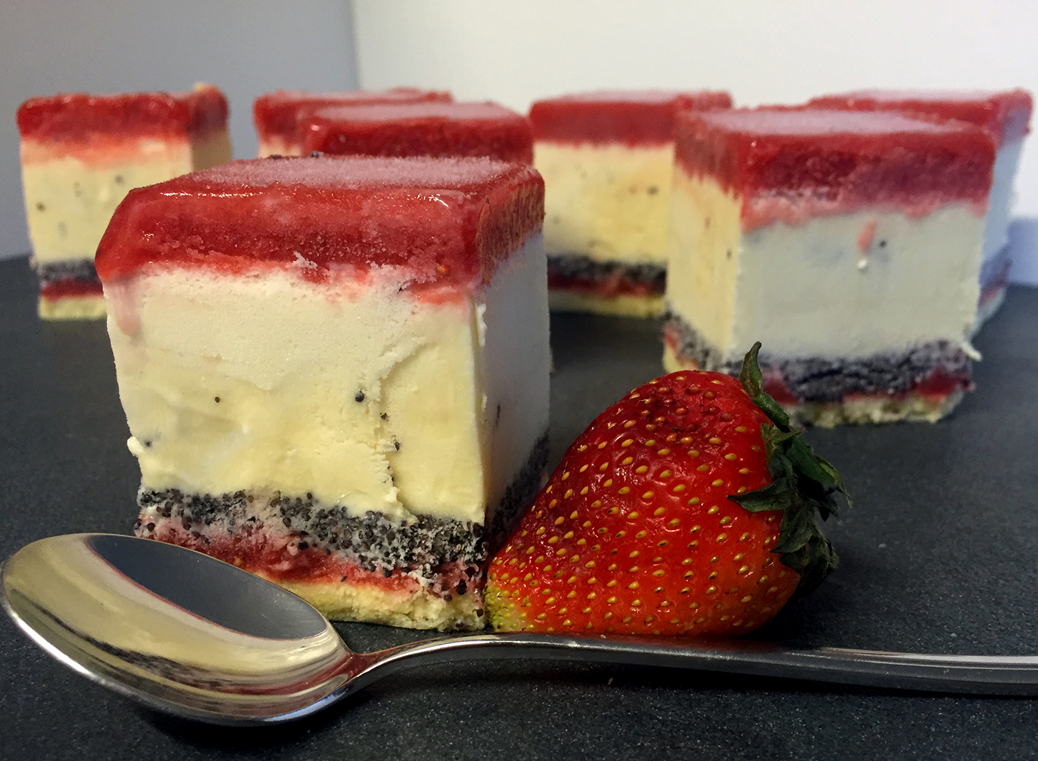 Mein Bruder hatte vor kurzem seinen 19. Geburtstag und ich habe mich selbstverständlich dazu bereit erklärt, dass Dessert zu machen. Mir war sofort klar, dass ich etwas aus dem neuen Buch machen wollte. Schlussendlich habe ich mich für diese Schnitten entschieden weil es die letzte Gelegenheit war nochmals etwas mit Erdbeeren zu kreieren und zudem wollte ich schon immer mit Mohn backen, habe aber noch nie ein passendes Rezept gefunden. Und es war die perfekte Wahl. Die Erdbeer-Mohn-Kombination ist sehr spannend für jeden Gaumen und mal was anderes für die, die sich ein aussergewöhnliches und doch auch bodenständiges Dessert wünschen.